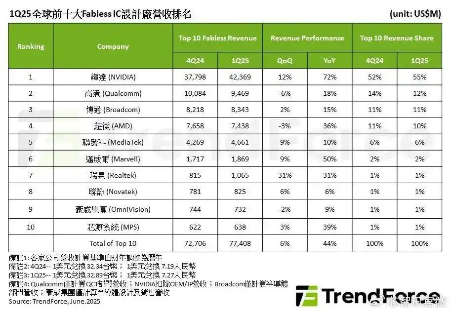 当前位置:首页>文章中心>行业新闻>2025Q1全球十大IC设计厂商:英伟达稳居第一,豪威第九!
